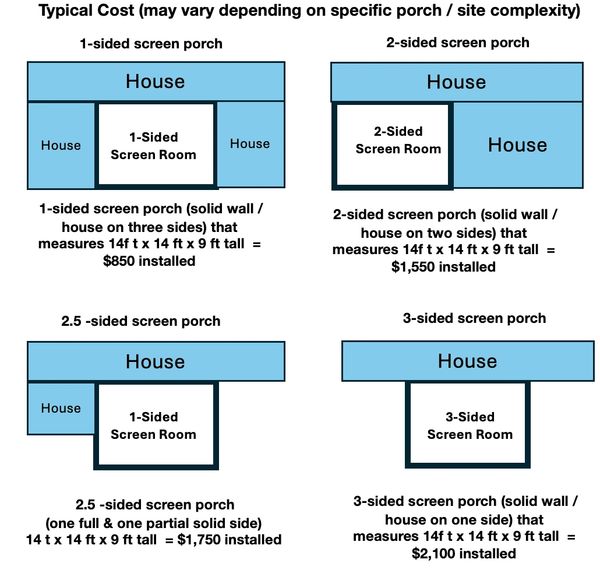 New 2026 pricing for your custom made snap in clear plastic porch covers. We have lowered our cost through improved supply chain management. Prices range from $850 to $2,450 for the typical porch styles in the area per diagram above. Customer made for your screen porch right here in North Carolina.